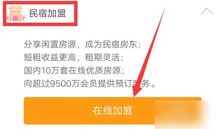 在页面中点击民宿加盟选项,在弹出的窗口栏中点击在线加盟选项