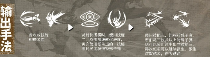 释放技能1后,角色将继续积攒灵能,此时可衔接使用技能2。虽然技能2不具备回复灵能的效果,但其发射的特殊子弹具有远超普通攻击的伤害表现,是主要的输出手段之一。而技能3则依赖于消耗这些特殊子弹,每当累计消耗超过3枚时,便可激活派生机制,允许再次释放技能3,并随派生次数增加获得更高的伤害加成,形成滚雪球式的输出爆发。