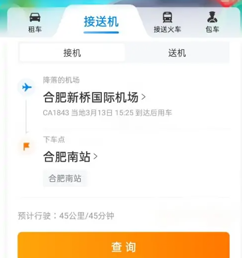 在接机页面,设置行程,点击查询。