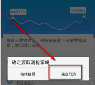 5、进入取消订票的界面,系统会提醒是否要继续抢票还是取消,点击确定取消后,系统就会自动退钱到之前的银行账户或者是微信钱包,到账时间一般都比较快,为1到2个工作日。