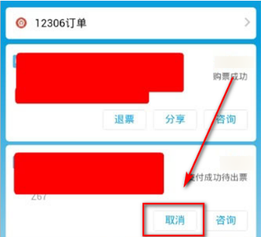 3、进入到订单列表的订单界面后,浏览你的12306历史订单,找到你要取消的订单,点击你要取消订单的按钮。