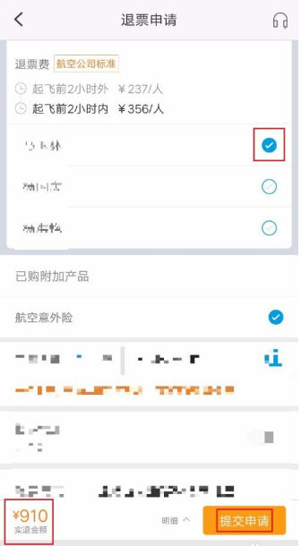 第七步:确认好退票手续费,选择需要退票的乘客,在右下方系统会计算出扣除退票手续费的剩余金额,确认无误后,点击“提交申请”即可退票/改签成功了,如图所示