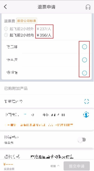 第六步:进入“我要退票/我要改签”申请页面后,退票费会根据飞机起飞时间显示出需要支付手续费,如图所示