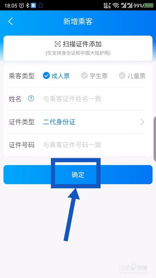 5.在打开的新增乘客界面,添加乘客的信息,点击底部的确定,常用乘车人就添加完成了。如图