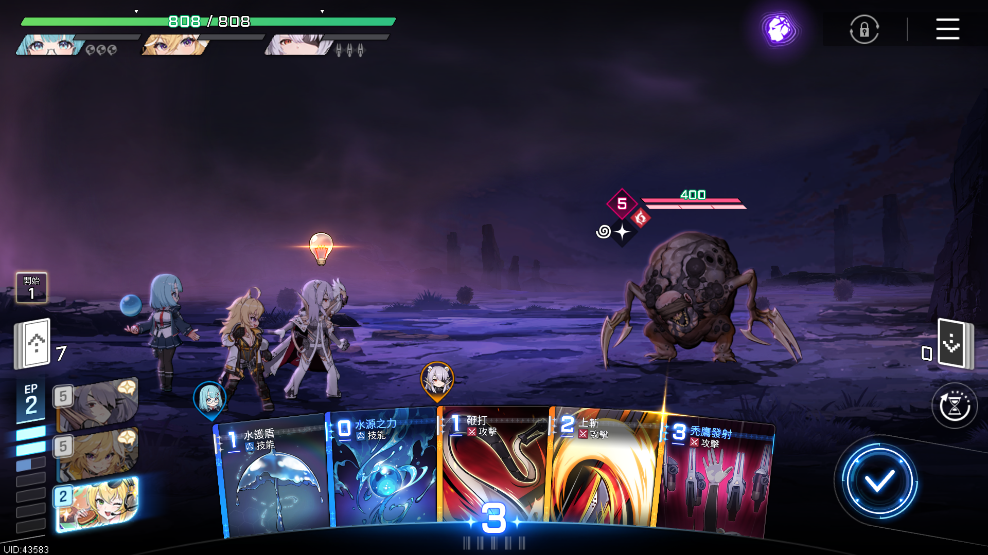 以梦境模式下的卡厄斯为例,该玩法附带全局增益效果。开局首先进入buff选择界面,每局随机生成不同增益选项。界面左下角设有两个功能标识:编队用于查看队伍状态,卡牌则展示当前卡组构成。正式开始后,左侧显示地图路径,右侧为行进方向选择,图标提示包含普通战斗、精英战斗、事件、休息点及航点。航点机制至关重要——只有抵达首个航点后,本次进度才能完成存档,若在此之前退出,则无法保留任何成果。