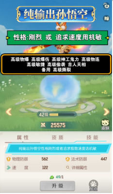 纯输出孙悟空在性格方面可以选择刚烈,有效提升10%的暴击率,降低5%的防御力,可以追求极限输出。机敏可以提升10%的速度,可以选择优先的出手。在加点方面可以选择全武力能够最大化伤害,当然也可以选择四力一敏,不仅会有速度,而且还可以直接抢占先机。在核心技能书方面,高级物爆、高级爆伤、高级物连、高级神功,都是可以选择的,能有效强化输出的核心。高级敏捷就能迅速的提升15%的速度,让孙悟空在战斗的过程中就可以优先出手,轻松就能秒杀敌方的脆皮。高级偷袭在攻击时就可以直接忽视目标10%的物理性防御,可以进一步的提升伤害的穿透性。