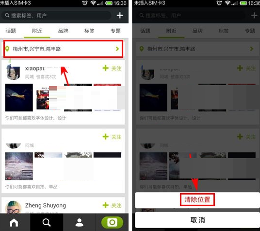2)进入到附近页面后,点击上方的【地理位置】一栏,弹出选项,点击【清除位置】即可。(如下图)