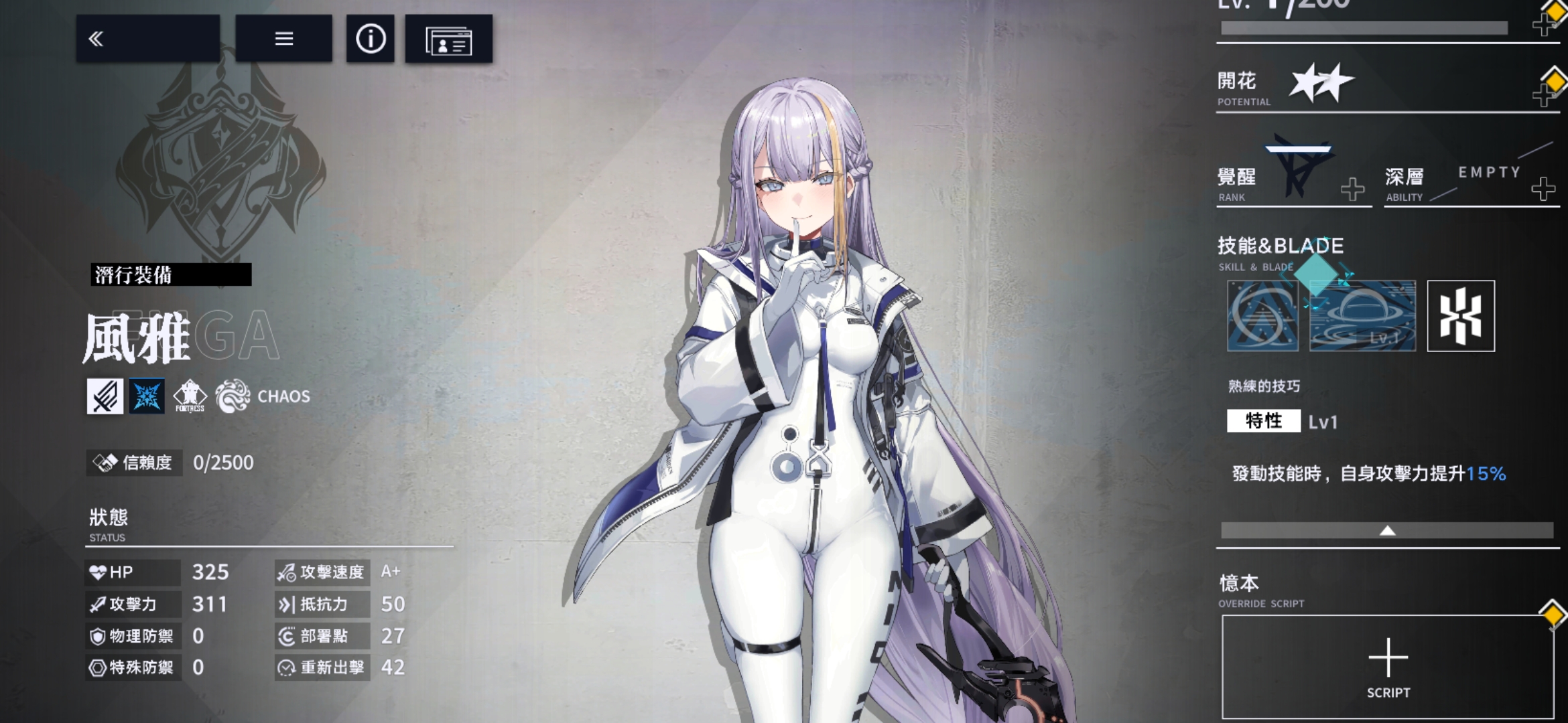 风雅的定位是反击型前锋。她的技能能在反击状态下减少所受伤害,并在被攻击时立即打出多段物理反击,极大提高输出效率。BLADE技能则能在大范围内释放连续攻击,兼顾进攻与防守。风雅的优势在于攻守一体,她既能在前排承担伤害,又能依靠反击不断消耗敌人。