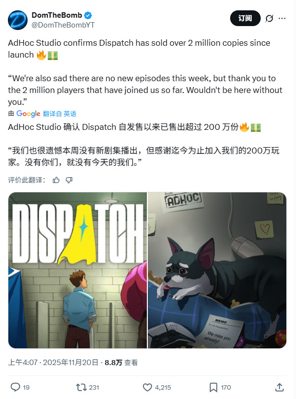 时间:2025-11-24 | 作者: | 阅读:0Steam上好评如潮的全新IP《超英派遣中心(Dispatch)》取得骄人成绩:发售不到两周销量超100万,发售一个月销量便突破200万套,Steam获得压倒性的97&好评率,MTC综合均分89分,PS商城评分4.96分,Steam在线峰值超过22万。