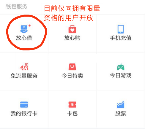 若已获取开通资格,在钱包界面“放心购”旁边出现如图【放心借】入口。
