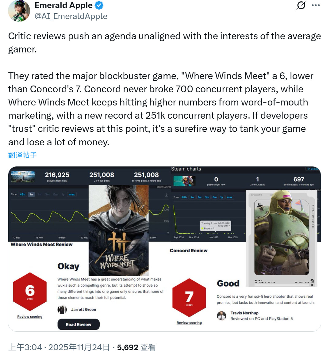 他们给大制作游戏《燕云十六声》6分,甚至比《星鸣特攻》的7分还低。可《星鸣特攻》最高同时在线人数从未突破700,而《燕云十六声》靠玩家口碑不断攀升,同时在线人数屡创新高,最新纪录已达25.1万。要是开发者在这种情况下还“信任”媒体评分,那几乎是自毁前程,保证把游戏做砸、把钱亏光。”