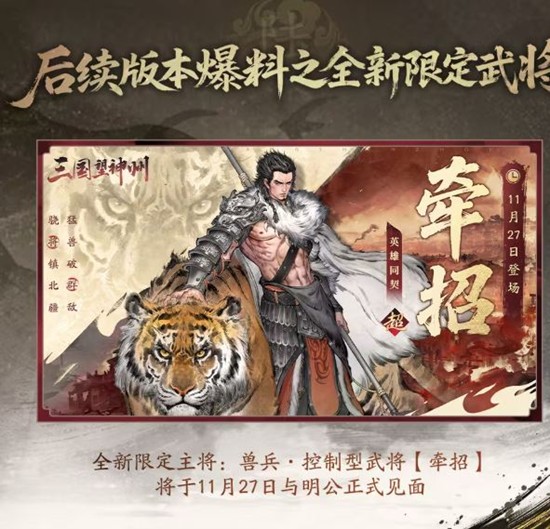 全新限定主将:兽兵·控制型武将【牵招】将于11月27日与明公正式见面。