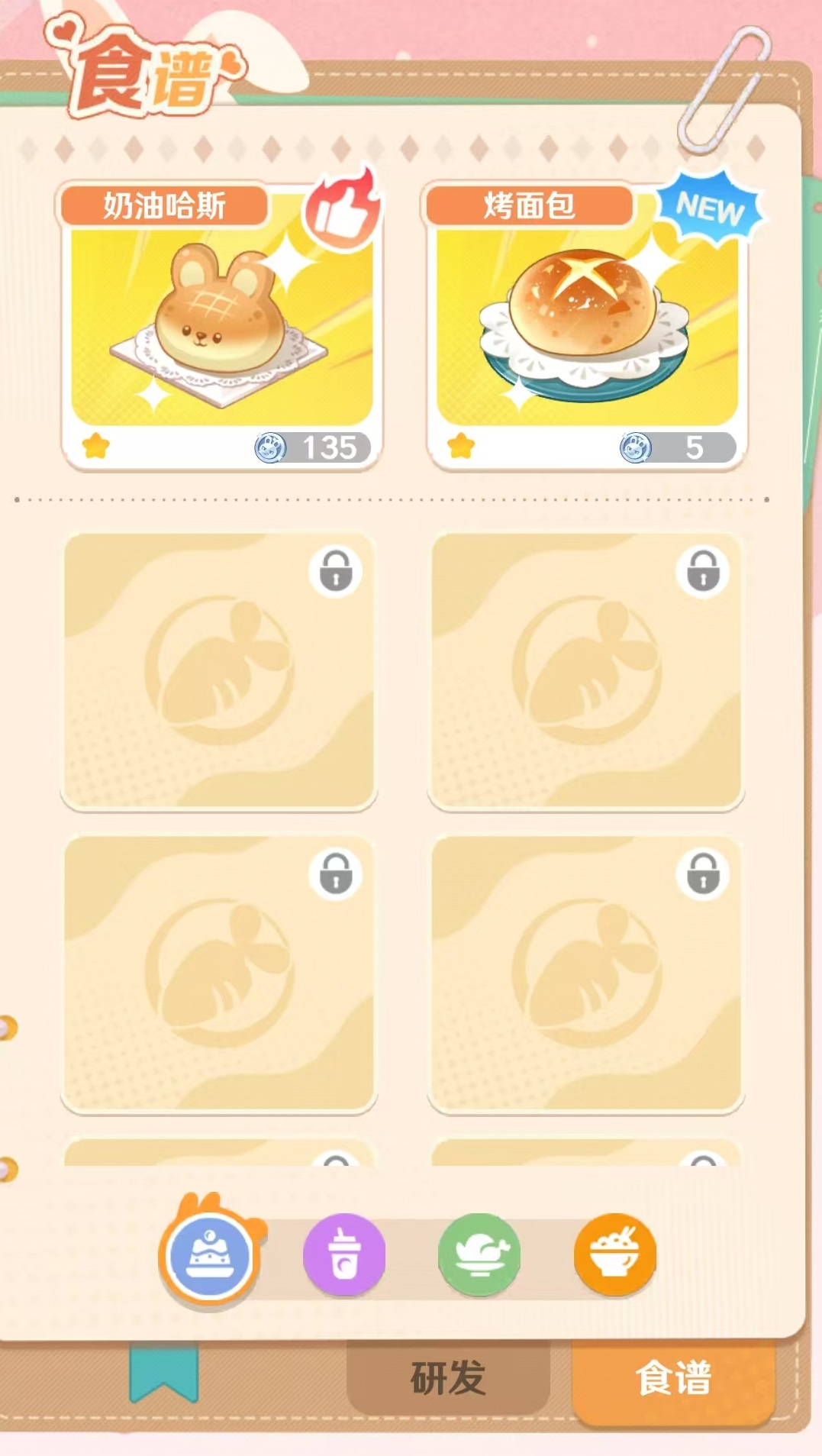 目前在游戏中可以通过研发解锁、完成任务和特殊事件、购买获取等一系列方式来获得,其中主要还是依靠研发。进入游戏后只需要点击前台上的按钮进入的菜谱界面,可以看到当前所有已经解锁的美食食谱。不同是否有着不同的升星消耗做法以及对应的售价和制作时间。大家在游戏中只要达到特定的条件就会收到食客的电话,然后按照要求将食材准备好,并且配置对应的器械,就能够制作出新菜谱了。