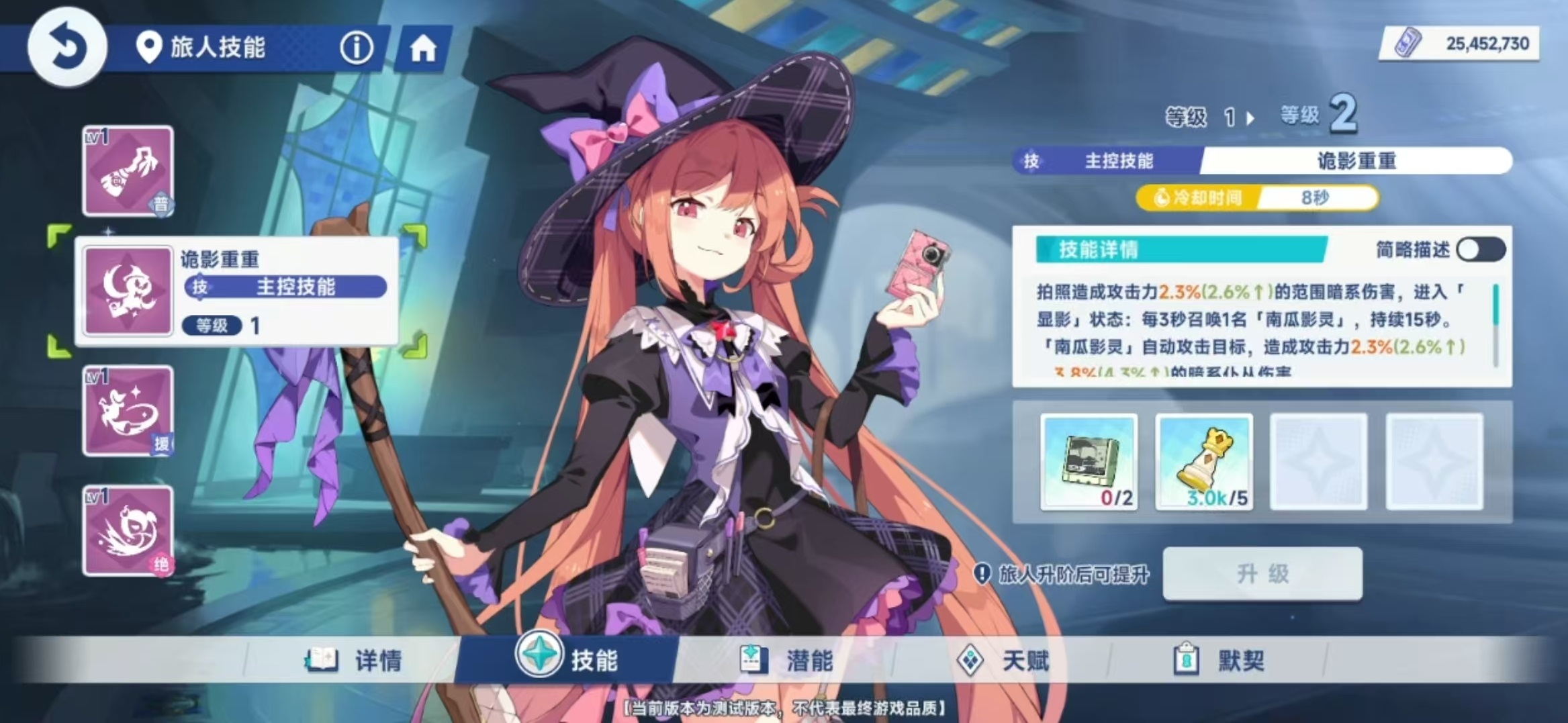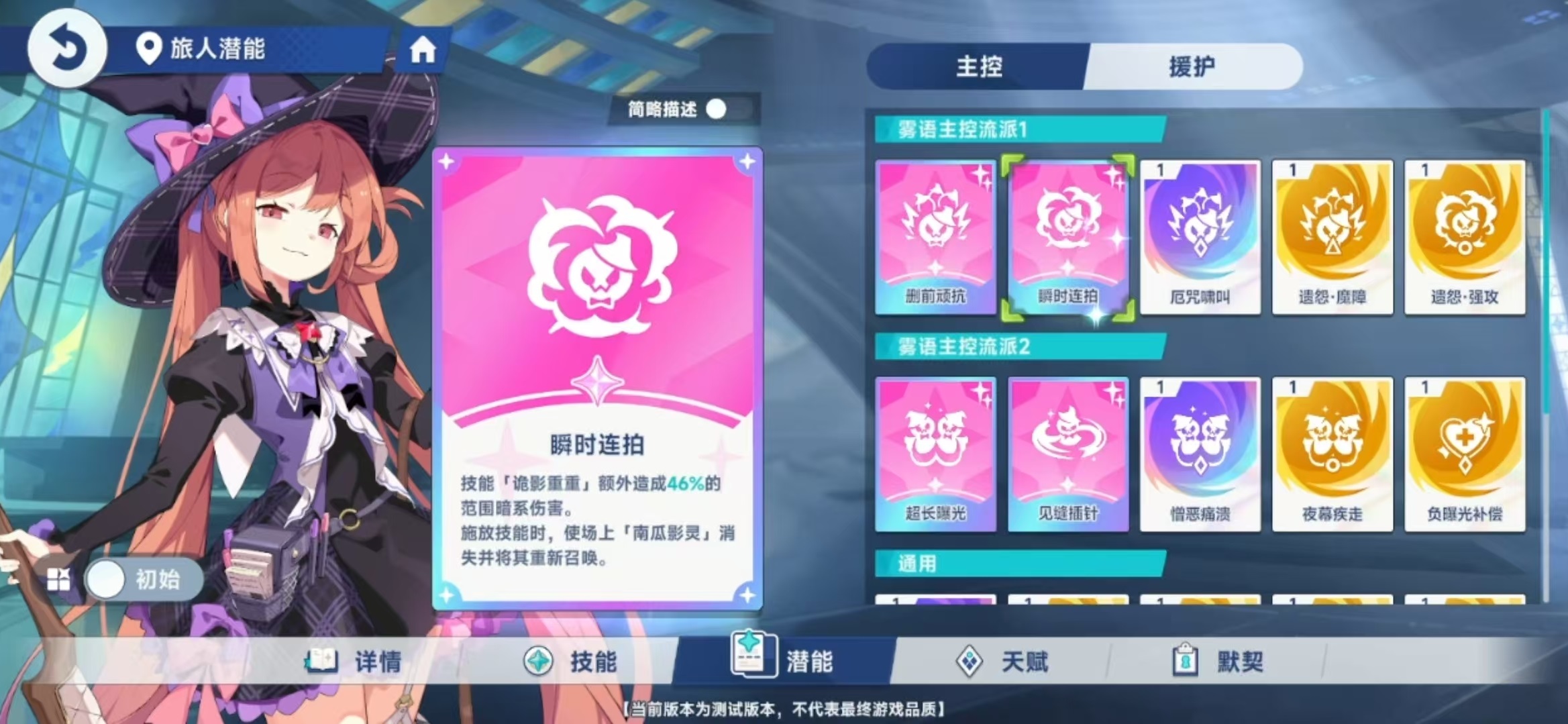 援护技能效果是召唤出法阵,每0.5秒钟就能召唤出一个提灯影灵,持续6秒,提灯影灵通过自爆,可以造成暗系仆从伤害,并附加暗吸印记。绝招效果是生成巨大影灵,对目标造成多次大范围暗系伤害。潜能方面可以选择删前顽抗、瞬时连拍、厄咒啸叫等。删前顽抗可以使技能诡影重重冷却时间缩短,在南瓜影灵消失时产生自爆,造成暗系仆从伤害。瞬时连拍使得技能诡影重重额外造成伤害,并在释放技能时,使场上的南瓜影灵消失重新召唤出来,重新计算时间。