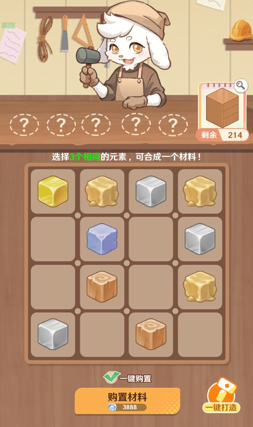 家具的制作流程有点类似消消乐,玩家需要先消耗资源生成打造元素,这些元素会逐一出现在尾尾木作的棋盘中。棋盘格子数量有限,当格子被填满时,就必须进行合成,否则无法继续生成新的元素。当玩家选中三个相同的打造元素后,它们会自动合成为一个新的打造材料。合成后的材料会被放入上方的材料栏中,如果五个格子全部被占满,就必须先使用这些材料进行家具打造。