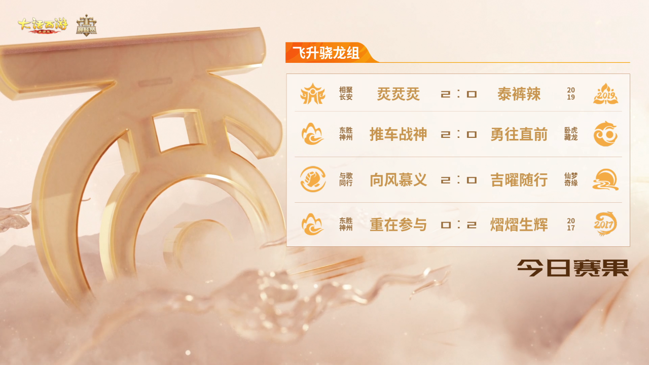 飞升骁龙组的赛事由『相聚长安』服务器【烎烎烎】对阵『2019』服务器【泰裤辣】,『东胜神州』服务器【推车战神】对阵『卧虎藏龙』服务器【勇往直前】,『与歌同行』服务器【向风慕义】对阵『仙梦奇缘』服务器【吉曜随行】,『东胜神州』服务器【重在参与】对阵『2017』服务器【熠熠生辉】。