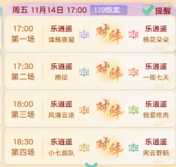 179惊龙组的对决将于今天17:00正式开启,赛事由『乐逍遥』服务器【清辉夜凝】对阵【桃花朵朵】,【南征】对阵【一周七天】,【风清云淡】对阵【我爱吃肉】,【小七战队】对阵【闲云野鹤】。