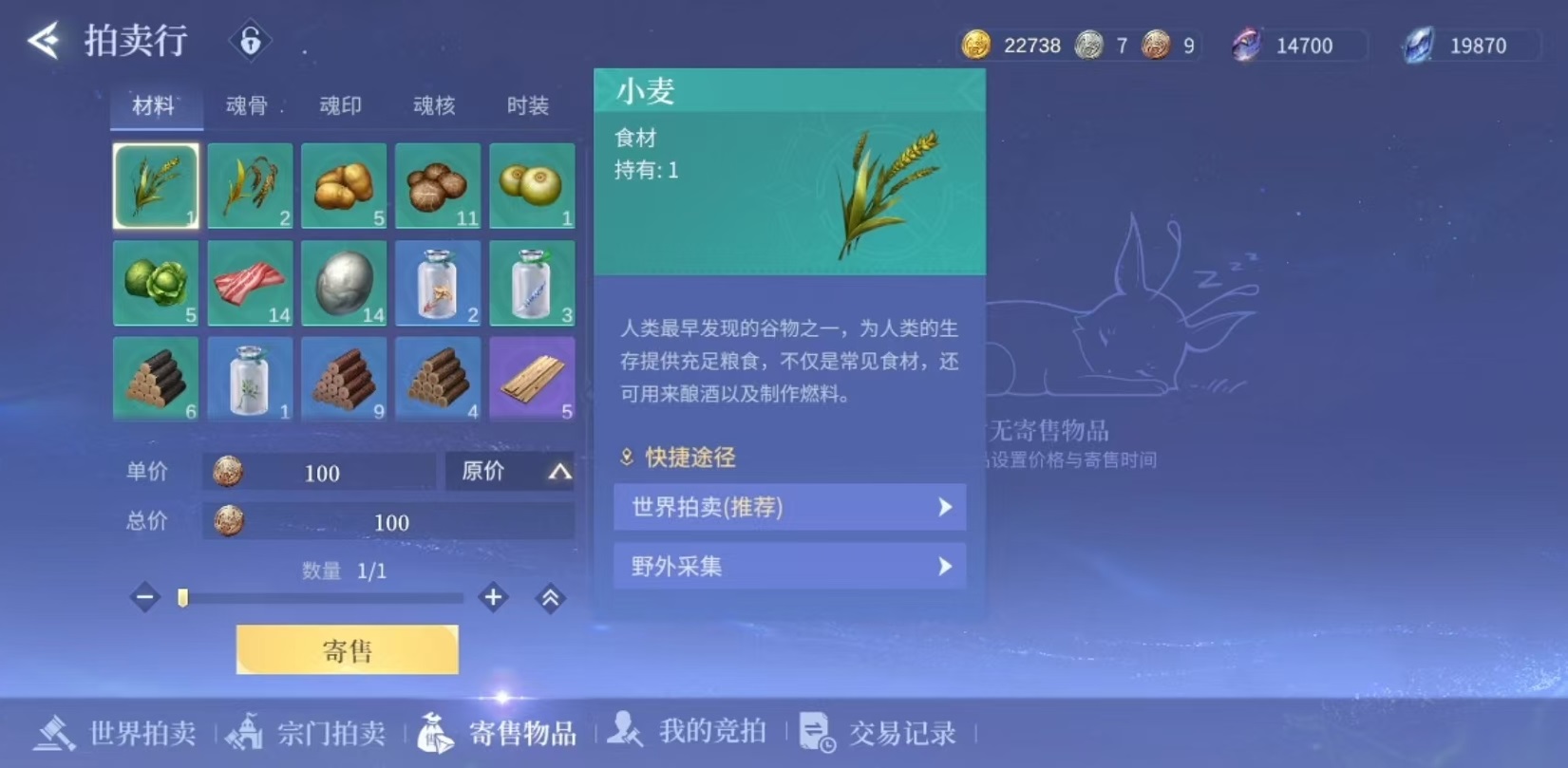 大家打开主页面之后,在右下角可以直接看到拍卖行的功能键,点击之后就能进入到拍卖行中,拍卖行又分为世界拍卖、宗门拍卖、寄售物品等各种分类。在这里可以直接查看到所有正在拍卖的物品。包括各种养成道具,还有坐骑等,都可以成为拍卖的商品。更细分还又分为基础材料、装备养成、毒草、药草、药品等,无论大家在大世界中采集到的基础资源,还是自己动手制作出来的成品,都可以直接在这里出售。
