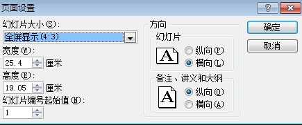 2、幻灯片大小:选择全屏显示(4:3),点确定。