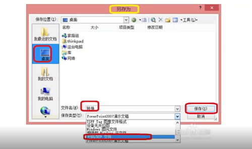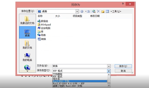 4.文件的名称设置为“转换”,点击文件保存类型,选择为“大纲/RTF文件”,点击右下方的”保存“。