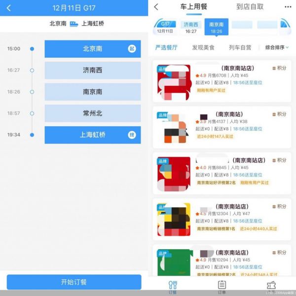 例如,在吃方面,铁路 12306 推出 ” 餐饮 · 特产 “ 服务。以 12 月 11 日,从北京南站到上海虹桥站 G17 次旅客列车为例,在选择出发和到达站点后,就能看到沿途提供外卖服务的车站,车上用餐既可选择车站内相关商家提供,也可以选择列车自营餐食。据悉,截至目前,全国有 84 个车站提供互联网订餐服务。在铁路 12306 App 可预订当天以及之后 14 天内的外卖,订餐成功后,铁路站车服务人员会按时把餐食送到订餐旅客指定的车厢和席位。