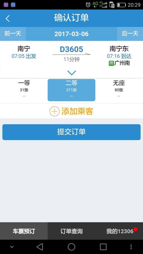选择席位,点击添加乘客,提交订单
