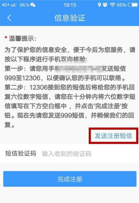 点击下一步后,就会进入到如下页面,认真阅读温馨提示后,点击发送注册短信,发送短信999给12306后,手机就会收到12306回复的验证码。