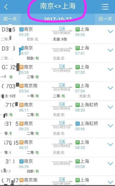 比如说我这里选择南京到上海的车,先看动车高铁系列的。选择一个合适的时间车次。