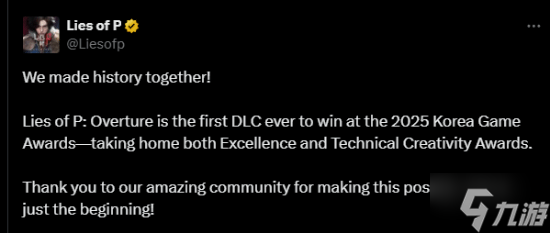 游戏官方今日发文庆祝,宣布游戏《匹诺曹的谎言:序曲》成为2025韩国游戏大奖史上首个获奖的DLC——同时斩获优秀作品奖与技术创意奖。官方写道:“感谢所有玩家与社区的支持,是你们让这一切成为可能。而这,仅仅是开始。”