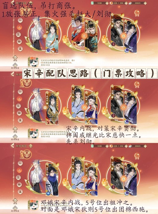 宋辛主队:1翻宋慈2翻辛弃疾,3翻朱元璋,4翻赵大或者奢香,5翻司马迁/窦奶/治疗。