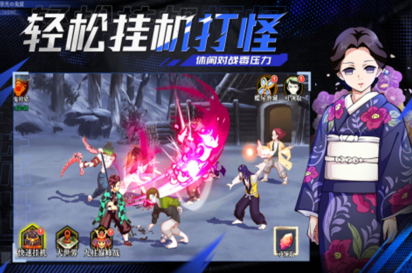 这是一款主打放置养成的卡牌类手游,玩家可通过收集并编组不同角色组成强力阵容,以回合制形式参与对战。游戏中完整再现了鬼杀队的主要剧情线,让你在推进主线的过程中回顾那些熟悉的情节。放置玩法降低了日常负担,无需频繁操作即可持续获得成长资源。策略重点在于根据角色特性搭配合理的阵容流派,而简化的培养体系也让角色养成过程更为高效便捷。