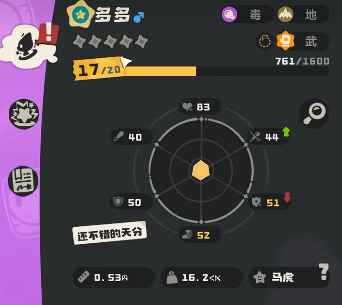 多多的核心特性是“毒牙”,该效果在成功使敌人陷入中毒状态后,可进一步降低对手的魔攻与魔防数值。这一机制在对抗高魔法输出的精灵时尤为有效,且由于多多自身技能多带有中毒附加效果,因此特性的触发频率较高,实战表现稳定。