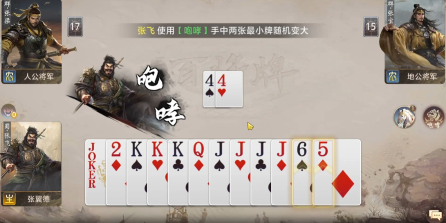 因为应对张飞也需要掌握适合自己的出牌顺序,这个时期大家可以故意打乱自己的牌型,比如上一手如果用对子拿到牌权,下一手就可以直接出三,这样就可以直接带走牌手上的大牌,有必要的话也可以留一手,比如手上如果有炸弹,就故意等到张飞出牌使用,强行破坏他出牌的节奏,那在这种被恶心的情况下,张飞也不是全无反制的手段,这个英雄最强势的一个点就在于,当手上有3张一样的牌时,好像随便变两下很容易就搏出一手炸弹出来,这时就可以直接用炸弹抢到牌权,最终获得胜利,所以使用张飞的关键就在于大家要在自身的手牌质量比较低的情况下,利用技能效果带来一个反击机会,其中的关键就在于要抓住对手出牌想要控场的时机了。