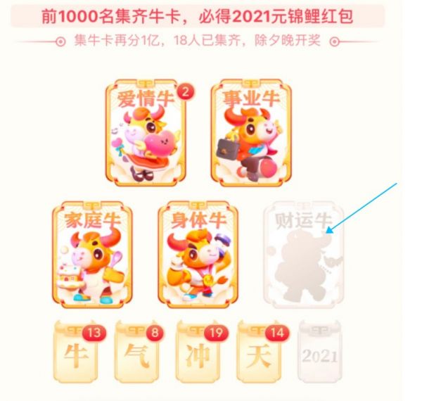 1、首先集齐爱情牛,事业牛,家庭牛,身体牛,财运牛五张牛卡卡片,还可以和其他集齐的用户平分1亿,2021大奖还是很不香的。