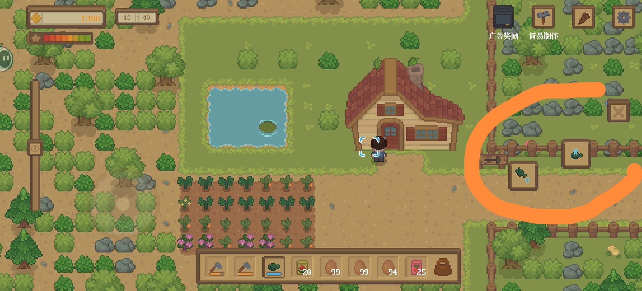 工具栏一个是开垦荒地,一个伐木一个挖矿,前期不要乱用(不想看广告的话),因为有耐久,其次背包有容量限制,只需要开垦空出十几块地种菜就行了,池塘可以补水。
