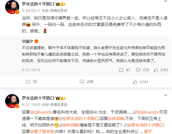不过,在本文发稿前,笔者查询搜索,罗永浩9月22日所发微博已不可见。