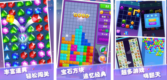 和俄罗斯方块的玩法特别相似,只不过在融入了很多创新式的玩法之后,给大家带来创新式的体验。其中涵盖6种不同的模式,比如有宝石消消乐,或者是宝石消消看等等,每种模式都有不同的要求和规则,比如前者可通过滑动屏幕的方式完成消除,而后者却可通过点击屏幕的方式将多个相同的宝石连接在一起。