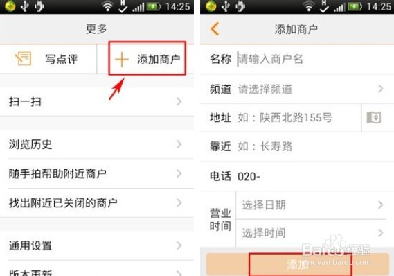 2、在首页的右上方,点击“添加商户”,一步步操作就OK了。(店名,地址,电话都可以加)切记选好频道,如餐饮店就应该在“美食”里。