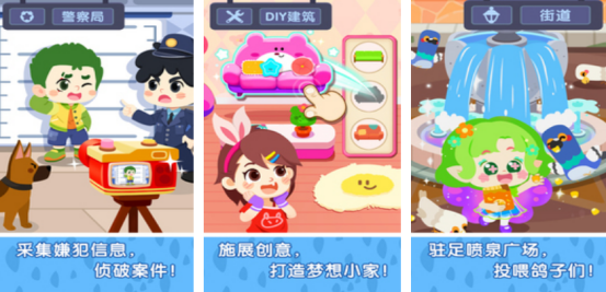 极高的自由度,所有的物品都可随意支配,宝宝们也可以随意扮演不同的职业角色,比如体验当人民警察的忙碌生活,每天上班之后并不是特别悠闲的坐着,反而及时接听各种求助电话,甚至还要记录好所有案件的详细过程。其次还可扮演医生或者是护士等等,其中没有设立任何的要求和规则,大家可尽情施展自己的创意,打造出特别梦幻的小家或者设计出特别繁华的喷泉广场等。