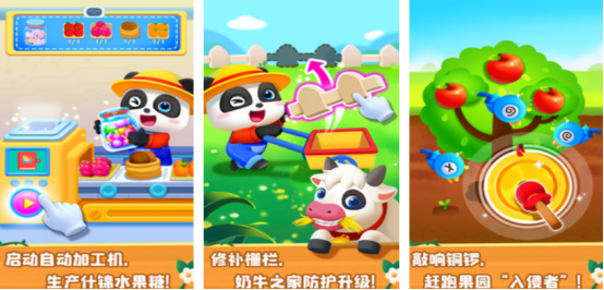 作为宝宝巴士所创作出来的这款农场类手游,已设立八大不同区域,包括农田或者是果园等等,每个区域都是需要由宝宝亲自来打理,比如在农田中,刚开始土地的规模并不是特别大,而且也是在杂草丛生,那么通过正确开垦的方式种植各种农作物,还要让种子茁壮成长,每次到秋天时硕果累累,或获得无尽成就感。还可经过一系列的加工,将这些农作物制作成成品销售到世界各地,拥有丰富的经济效益。