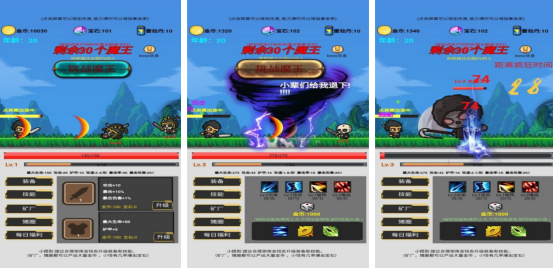 精致的画面,还有四大不同系统等大家来选择,比如有矿场系统以及猪圈系统等等,每个系统中都可随意探索,甚至还会给自己获得无尽的惊喜,提升自身的所有属性,包括生命值以及攻击力等等。在每个关卡中也会有30多个不同的魔王,只有将这些魔王全部打败后,才能成功拯救回村长,让自己的战斗实力逐渐提升,但需异常小心,魔王也会进入狂暴状态之下,每次的攻击速度都会翻倍。