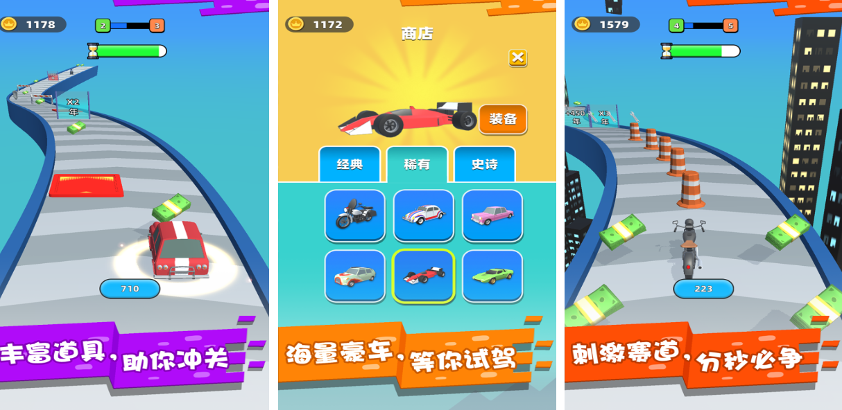 说白了本作其实就是个驾驶载具进行跑酷的休闲游戏,游戏中载具多样也有着特殊的收集钞票升级系统,在驾驶豪车跑酷过程中玩家必须解锁超多的钞票用来升级赛车,多样的道具帮助大家快速提高赛车的等级,真实车标加持的豪车看上去更是精致立体,各类豪车驾驶体系完善也有众多皮肤可切换,危机四伏的跑酷赛道等待着大家开车征服。
