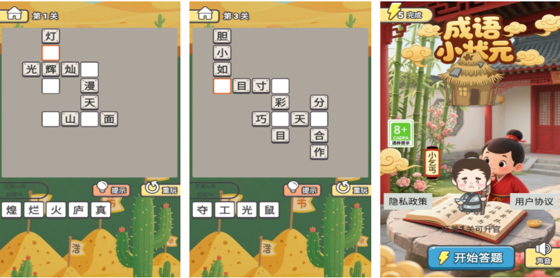 进入本作互动的玩家都有机会成为聪明的成语小状元,游戏所有的关卡模式完全是使用成语互动来运行的,答题方式特立独行再结合消耗体力的设定更显耐玩,玩家要尝试在空格区域写上各种汉字来完成成语,成语接龙的特殊主题带来的休闲气氛更是一绝,无数含义不同的成语知识会给大家提供超高沉浸感。