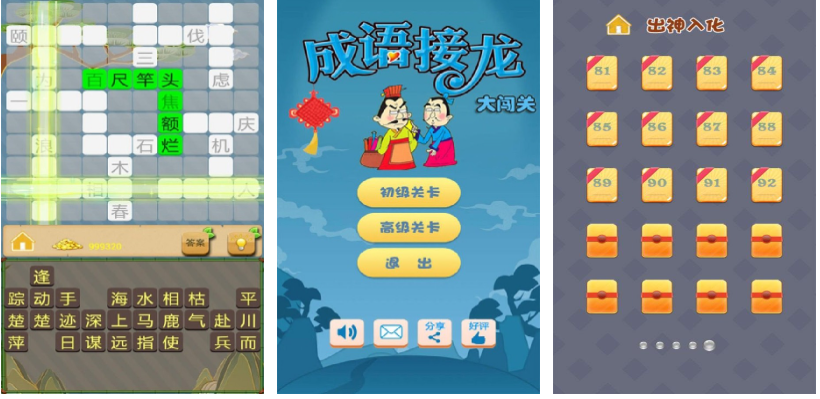 这是款把成语接龙知识跟闯关模式结合的单机游戏,众多成语知识点都分布在关卡中等待大家学习,并不算难的闯关流程带给人与众不同的新鲜体验,成语接龙游戏的精髓完美呈现使得高智商的玩家趋之若鹜,游戏包含的模式多样且都能塑造出不同成语的含义,利用成语接龙的特殊方式解谜闯关足以开发智商,初级以及高级等不同难度的解谜性质值得挑战。