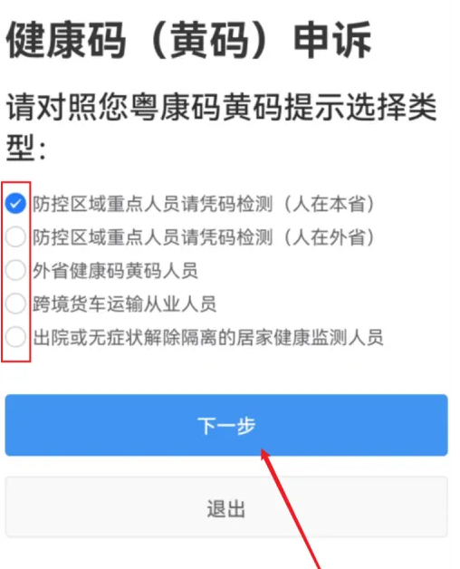 进入申诉页面后,勾选黄码提示类型,点击下一步。
