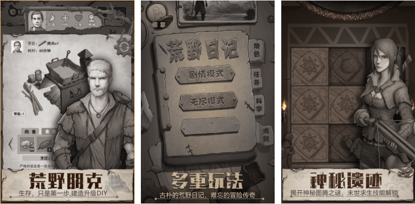 本作是款呈现出特殊野外朋克风格的荒野生存类手游,有着怀旧羊皮纸风格的美术UI跟多重玩法,神秘遗迹的加持让这款生存游戏更有神秘感,地图塑造极为恢弘但危险众多有着极强紧迫感,玩家要自己一个人进入野外地图跟各种野兽斗智斗勇,很逼真的生存感觉也令不少荒野求生类手游粉丝沉浸。