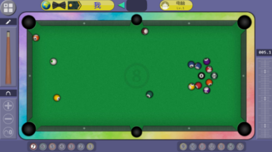 特别逼真的游戏画面,在屏幕上方还会看到我的分数值以及电脑的分数值,所有的球杆都放在了归属的位置上,大家在发射台球的过程中,可利用手指挪动球杆并精准瞄准,想方设法用最短的时间将所有球球全部打入袋中,就可获得更高分数。大家长时间体验就会让自己的台球技术有所提升,是放松心情的最好选择。