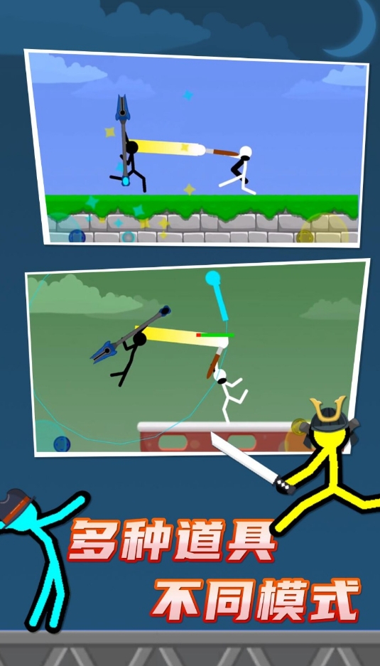 一款强调自由对抗的火柴人格斗游戏,两名玩家化身为简约风格的角色,利用各种奇特道具展开激烈对决。没有固定规则限制,只要能将对手击落平台或击败即可获胜。操作手感顺滑,按键响应灵敏,即使随意操作也能触发连贯动作,带来畅快淋漓的打斗体验。