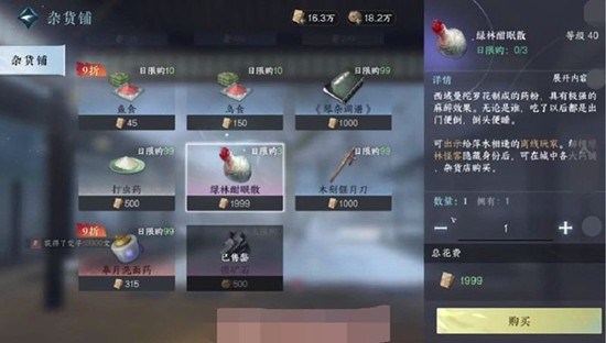 绿林酣眠散可以在游戏中的杂货铺购买,每日限购三个,总共只需花费5997交子。玩家可以打开地图使用寻人功能,找到最近的杂货铺并标记坐标前往购买。每个杂货铺都分布在逆水寒手游世界的各个角落。