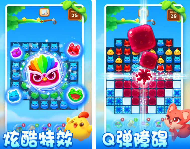 这是一个操作很简单的消除游戏,玩家需要通过移动位置相邻的两个图案方块,把图案相同的方块凑到同一排就可以完成消除,最少需要三个相同的方块可以进行消除,如果能凑成特殊形状或数量,比如十字型、T字型等,消除后还能获得惊喜道具,可以一次性消除大量方块,每一关的任务不一样,需要达到任务要求才能过关。